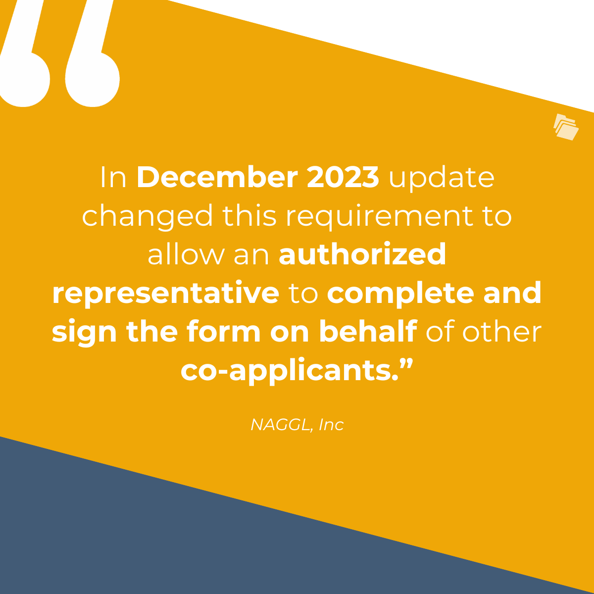 In previous versions of Form 1919, each co-applicant had to prepare and sign their own copy of the form, but the December 2023 update changed this requirement to allow an authorized representative to complete and sign the form on behalf of other co-applicants.